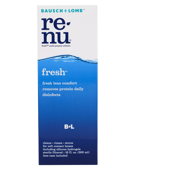 Renu Fresh multi purpose solution is specially formulated to work with your natural tears. Experience the feeling of wearing a fresh pair of lenses cushioned in moisture. Cleans loosens and removes accumulations of film, protein, other deposits, and debris from soft contact lenses. Removes protein most effectively when used daily. Destroys harmful micro-organisms on the surface of the lens. Rinses, stores, and wets lenses before insertion.